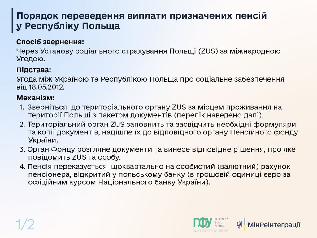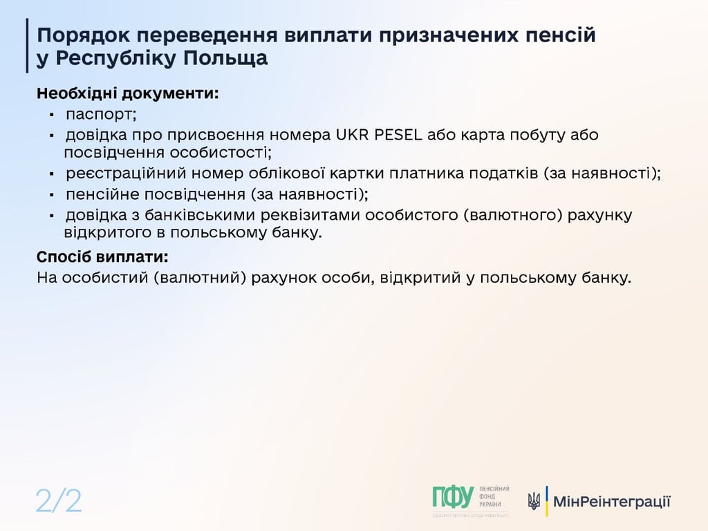 В Министерстве по вопросам реинтеграции временно оккупированных территорий объяснили, как украинским гражданам пожилого возраста, временно получившим убежище в Польше, перевести пенсионные выплаты из Украины. Там предложили пошаговую инструкцию.