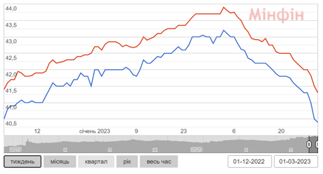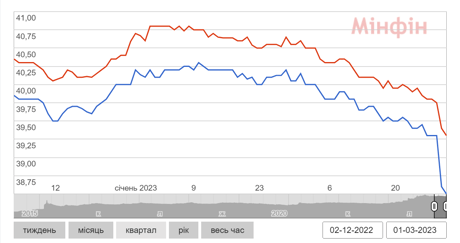 Динамика наличного курса гривни к доллару США, декабрь 2022 — февраль 2023