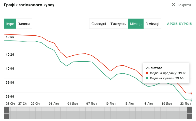 Так, курс знижується як на чорному ринку, так і в банківських установах. Ціна валюти на готівковому ринку станом на 23 лютого сягнула таких значень за даними сайту Kurs.