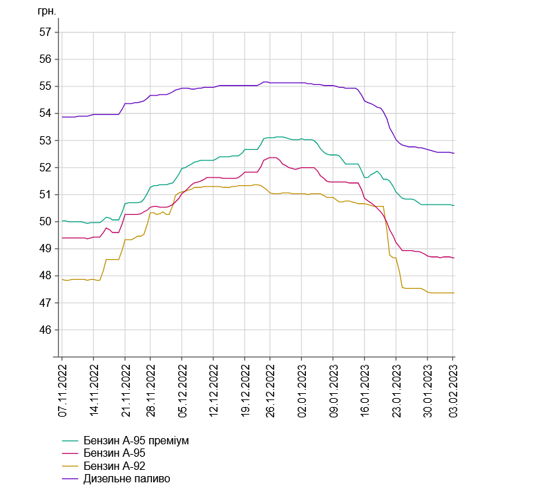 За інформацією порталу Мinfin, з кінця грудня 2022 року середня вартість дизельного палива знизилась на майже 5%, до 52,43 грн/л. Ціна бензину марки "А-95" впала на майже 7%, до 48,62 грн/л, а автомобільного газу — на понад 10%, до 26,30 грн/л.