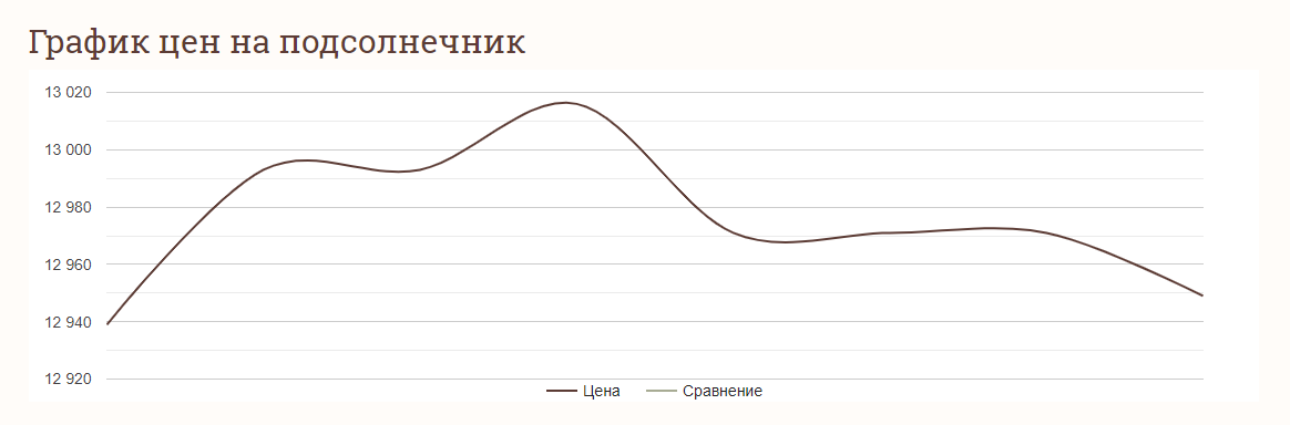 При цьому ціна на соняшник упродовж останніх значно коливалася. Так, у вівторок, 28 листопада, ціна на соняшник становила 12 939 грн за тонну. Вже на наступний день вона зросла до 12 993 грн за тонну і протрималася на цій позначці до четверга, 30 листопада. Далі вартість цієї зернової культури зросла ще раз — до 13 016 грн у п'ятницю, 1 грудня. А от в субботу, 2 грудня, вартість тонни цієї зернової культури обвалилася до 12 971 грн. Лише у вівторок, 5 листопада, ціна на цю зернову культуру знову почала зростати — до 12 949 грн.