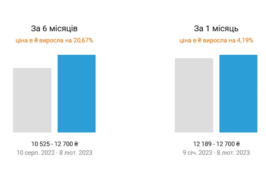 За останній місяць вартість зросла на близько 510 гривень, з 12,2 до 12,7 тисячі гривень.