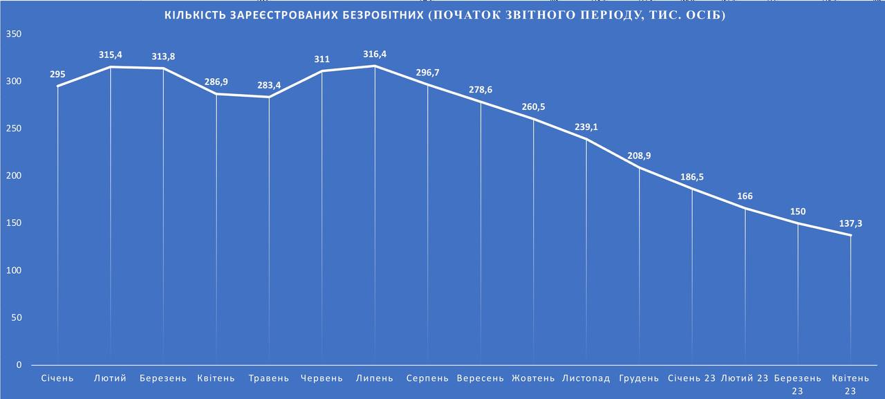 В Україні кількість українців, які не мають роботи, продовжує знижуватися із червня минулого на тлі війни. Так, у квітні вже налічується 137,3 тисячі офіційно зареєстрованих безробітних.