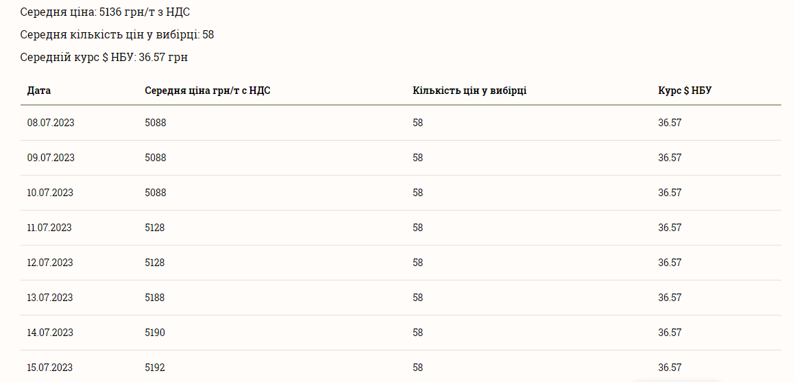 Повідомляється, що вартість однієї тонни зерна пшениці становить в середньому 5136 грн/т з НДС.