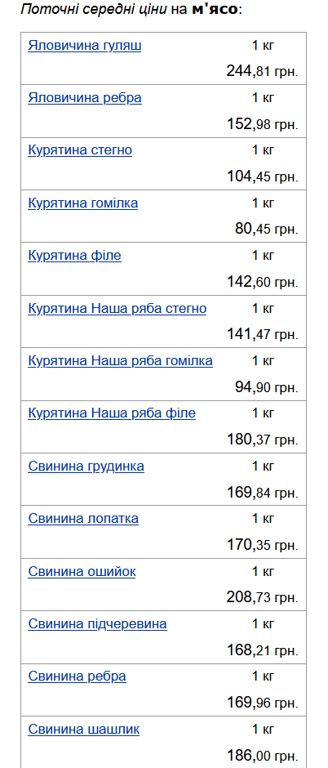 Підвищилися ціни на яловичі ребра. У березні кілограм продавали за 144,49, а в квітні — за 152,98 гривні. Яловичина (гуляш) зараз коштує 244,81, тоді як місяць тому можна було купити за 237,94 гривні.