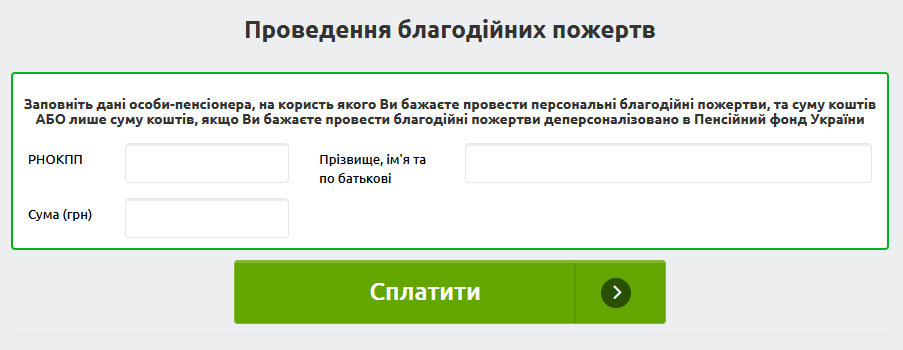 - благодійний внесок на користь конкретного пенсіонера, вказавши суму коштів, прізвище, ім'я та по батькові отримувача, реєстраційний номер облікової картки платника податків (РНОКПП);