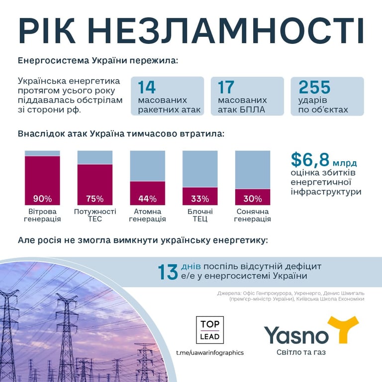Там розповіли, що українська енергетична система упродовж року пережила 14 масованих ракетних атак, 17 атак ударними безпілотниками. Було завдано 255 ударів по енергооб'єктах.