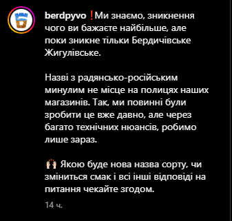 "Ми знаємо, зникнення чого ви бажаєте найбільше, але поки зникне тільки Бердичівське Жигулівське. Назві з радянсько-російським минулим не місце на полицях наших магазинів. Так, ми повинні були зробити це вже давно, але через багато технічних нюансів, робимо лише зараз", — йдеться у повідомленні.